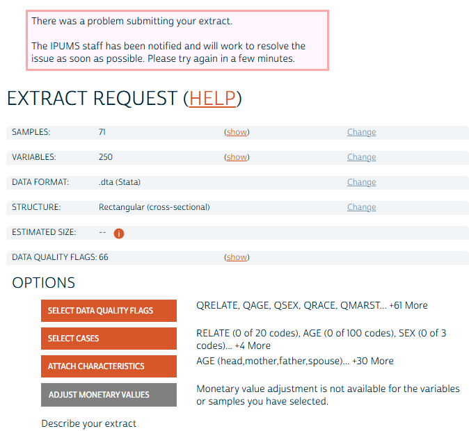 I am having an issue downloading IPUMS CPS data this morning. I have tried different sample sizes a few times and have not been able to get the query to work. Please help!